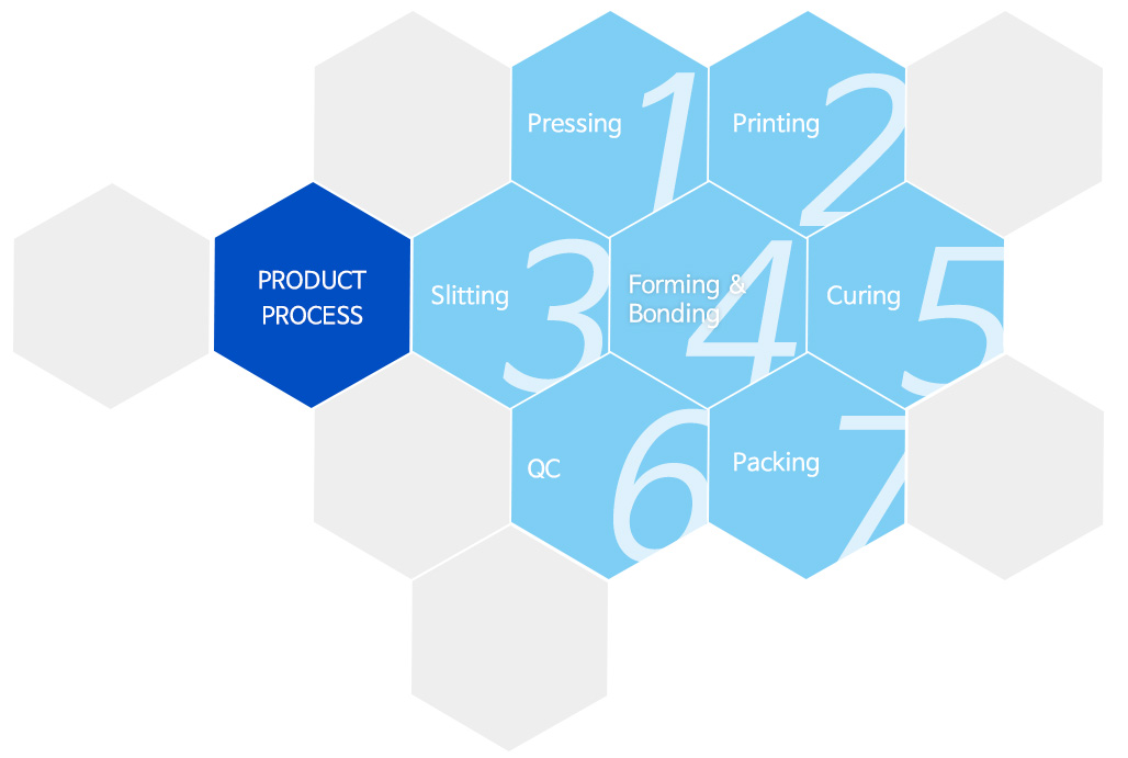 1. Pressing → 2. Printing → 3. Slitting → 4. Forming & Bonding → 5. Curing → 6. QC → 7. Packing